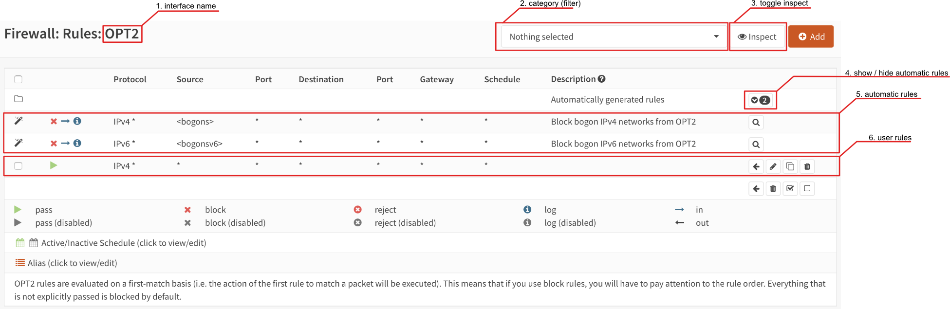 Our overview shows all the rules that apply to the selected interface (group) or floating section. For every rule some details are provided and when applicable you can perform actions, such as move, edit, copy, delete.