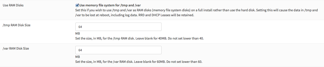 In case of a minimum install setup (i.e. on CF cards), OPNsense can be run with all standard features, except for the ones that require disk writes, e.g. a caching proxy like Squid. Do not create a swap slice, but a RAM Disk instead. In the GUI enable and set the size to 100-128 MB or more, depending on your available RAM. Afterwards reboot.