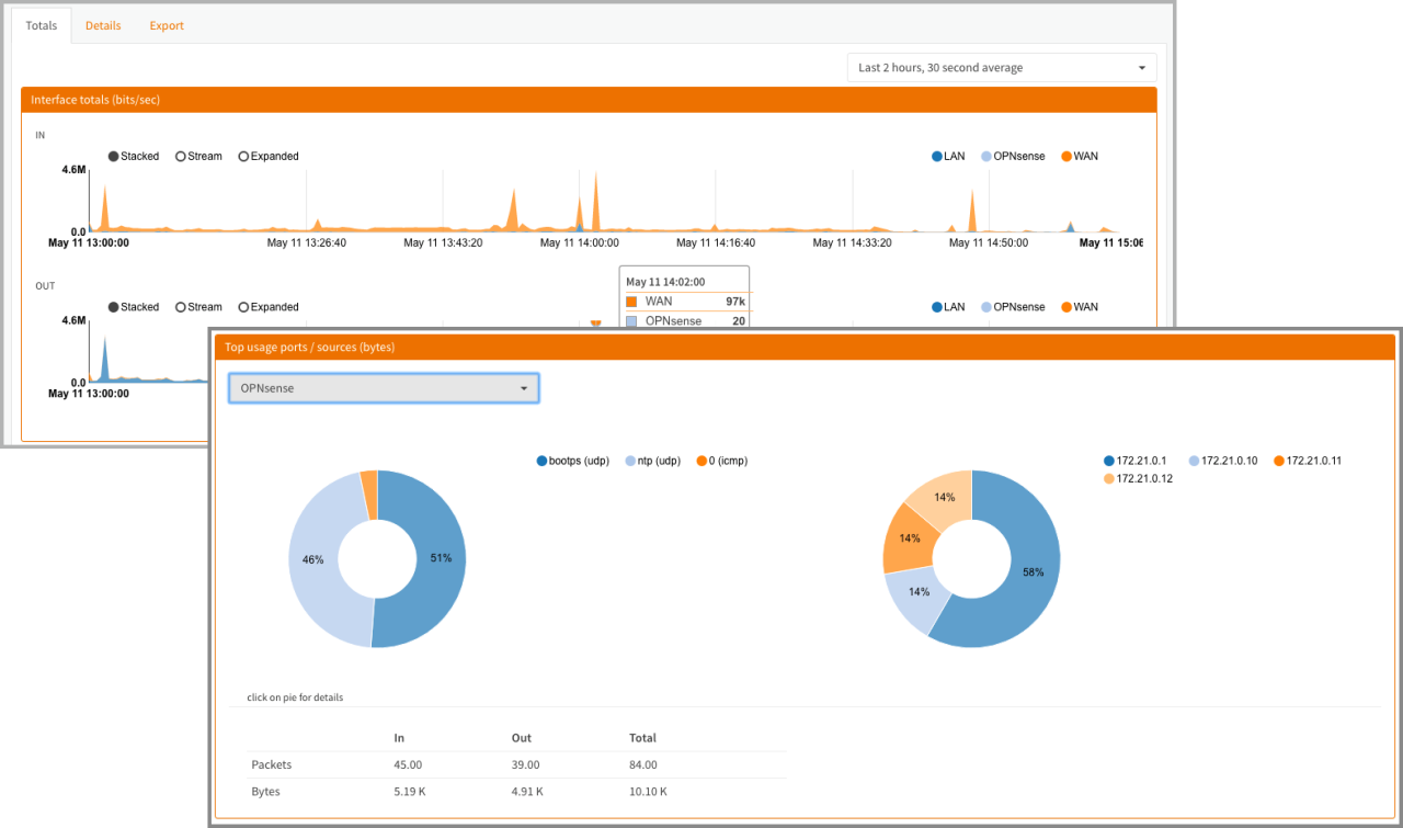OPNsense is the only open source solution with a built-in Netflow analyzer integrated into its Graphical User Interface. It can be accessed via .