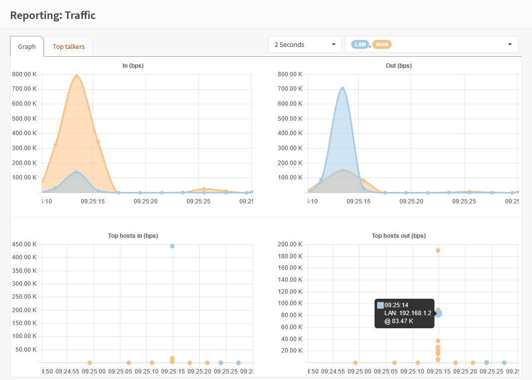 The graph below shows the top consumers over the same timespan, when you point to a dot it will show you the measured bandwith for the selected host (the color matches the interface).