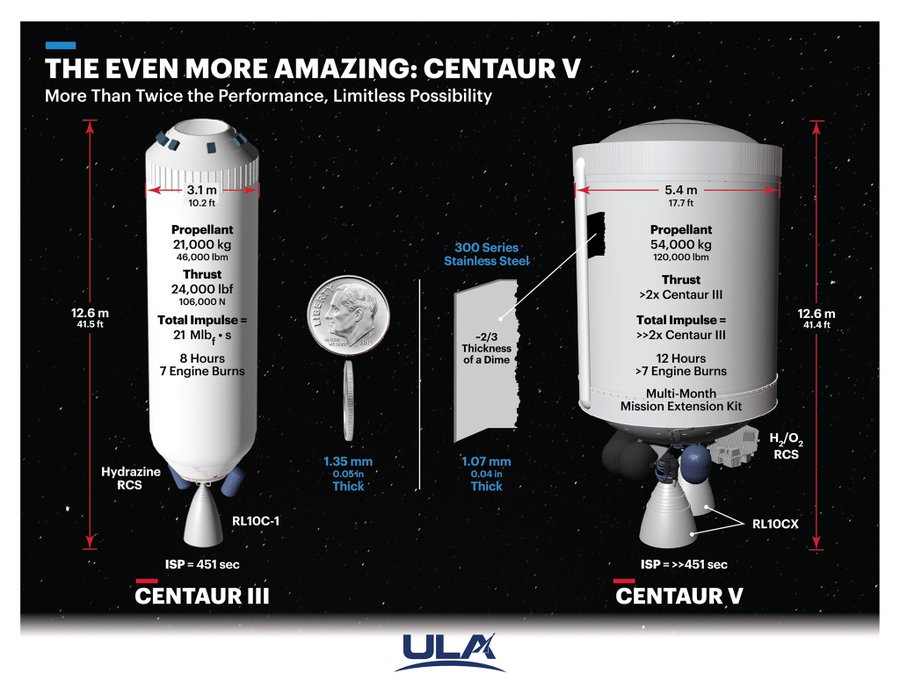 This graphic of Centaur V vs. Centaur III comparison is awesome. Was released by ULA CEO Tory Bruno a year ago (Sept. 2020). Sep 16, 2020 A lot more energy, and a few other new technologies