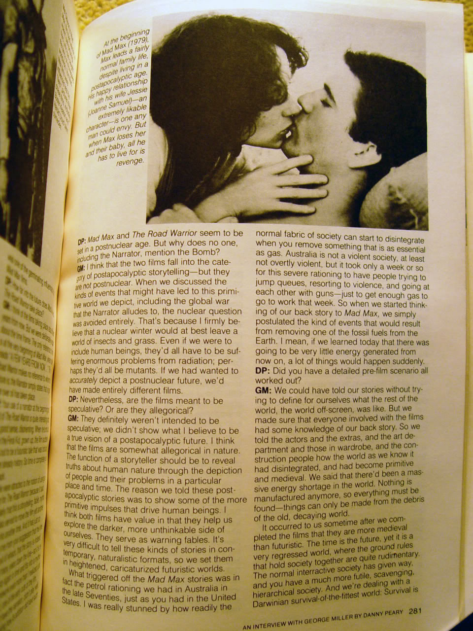 - Well, the whole point of the villains wasn't that they were all gay, but that they were heightened to an almost mythological degree - thus, the Humongous being a sculpted hulk of a man in a faceless mask, and the rest of the marauders wearing similarly wired-up clothing, uniforms and colors. All of this is due to the narrator, looking long back into the past and mythologizing the tale for his listeners - this is also acknowledged in the film's skewing of time, with the narrator looking into a distant past that is actually the near future of the viewer. Miller says as much in this article/interview by Danny Peary from his third installment of the Cult Movies books: http://thefilmist.wordpress.com/2009/09/19/danny-peary-on-mad-max-2the-road-warrior/ —Preceding unsigned comment added by 99.34.251.199 (talk) 09:33, 9 January 2010 (UTC)